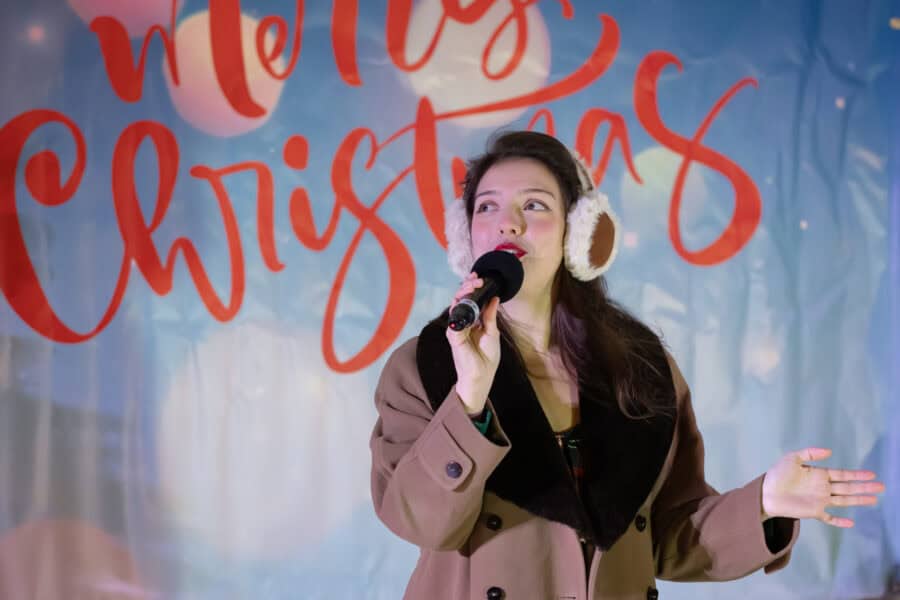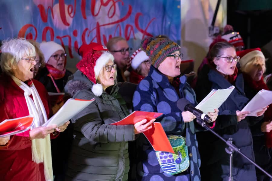 Hundreds of people lined Farsley Town Street – and braved the heavy showers – to celebrate the switching on of Farsley’s Christmas lights.