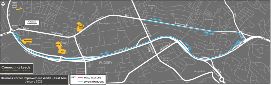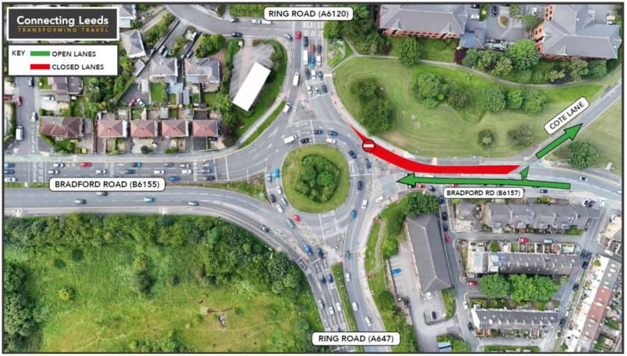 As part of the final road layout, Yorkshire Water needs to move an existing water supply. The lane closure will be on Bradford Road towards Stanningley, affecting the eastbound lane of the Dawsons Corner roundabout (the same as in September 2025).