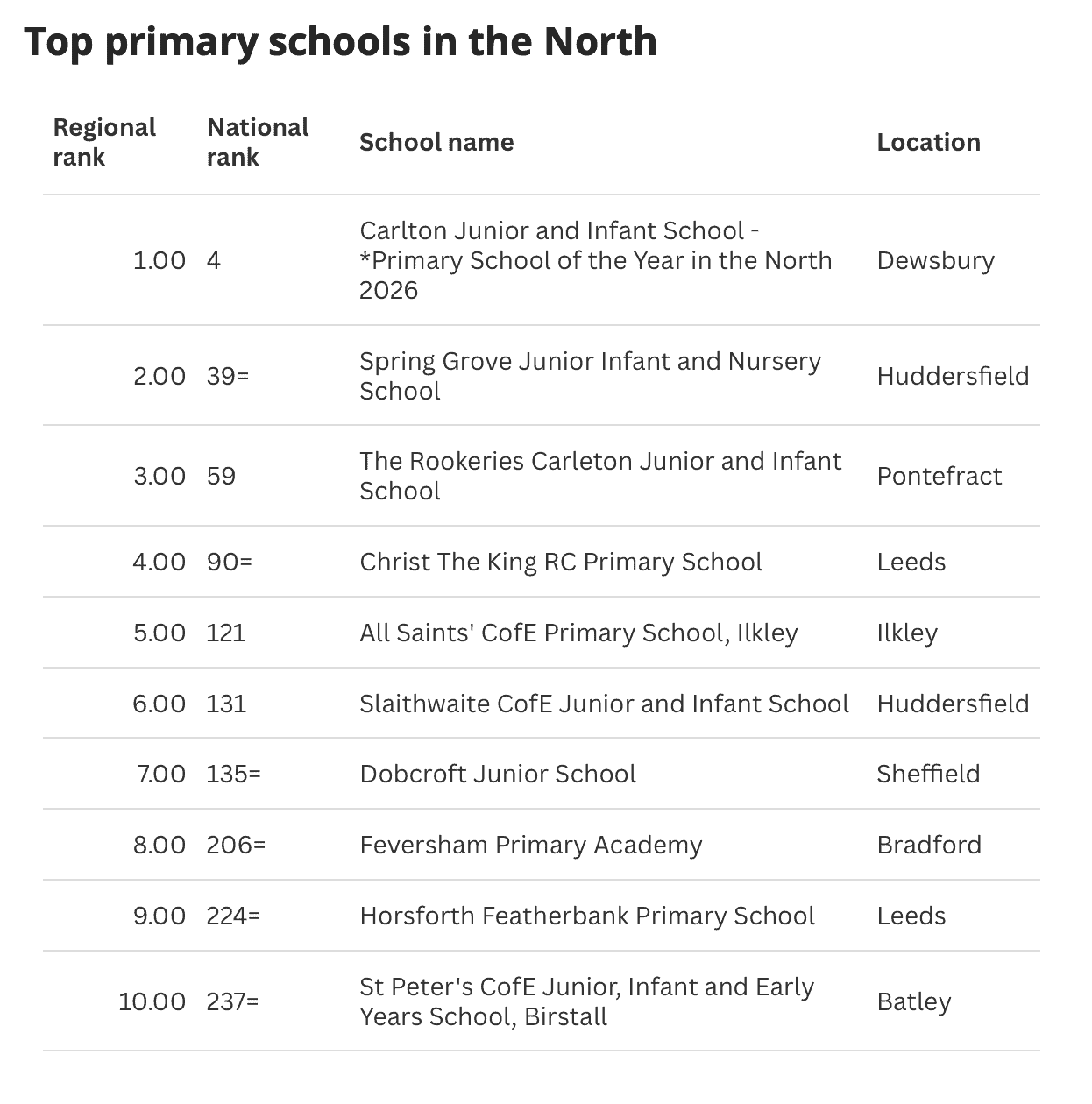 Christ the King Primary in Bramley was ranked fourth in the top primary schools in the North, 90th in the entire country.