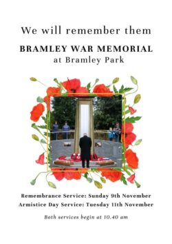 Please join us at Bramley War Memorial for our annual Service of Remembrance on Sunday 9th November to remember all those who gave their lives at home and abroad – those whose sacrifice allows us to live in the freedom we enjoy today. We will be remembering with gratitude and sorrow all the service personnel – the Royal Navy, the Army, the Royal Air Force, the Royal Marines, the Merchant Navy, the Fleet Auxiliary – from all parts of the Commonwealth. Join us in creating our Field of Remembrance when we place individual crosses – each with the name of one of those inscribed on the war memorial. We remember too all those who served on the Home Front – the firefighters, the air raid wardens, the doctors and nurses caring for the wounded, the men and women in reserved occupations and those who took on the jobs of toiling in the mines, the factories and the fields – all these who played such a vital role in the war effort.