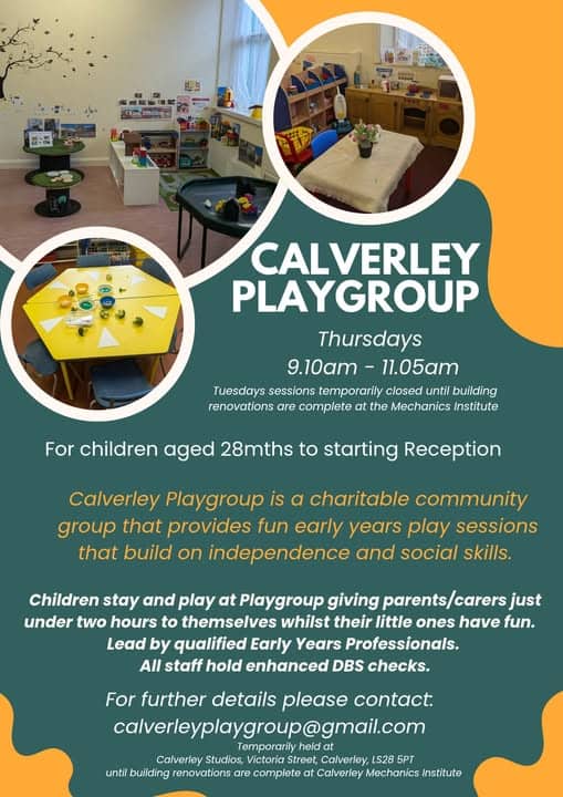 Calverley Playgroup will be running from Calverley Studios whilst the Mechanics Institute building renovations/library relocation goes ahead.