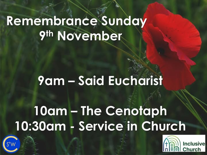 Sunday the 9th November is Remembrance Sunday and as usual we will have prayers at the Cenotaph at 10am followed by a non-communion service in church at 10:30am. This year we will also be having short Said Eucharist at 9am for those wishing to take communion. The Said Eucharist will be finished to allow folks time to walk to the Cenotaph if they wish or to remain in church and wait for the Remembrance Parade to come into church for the Remembrance Service