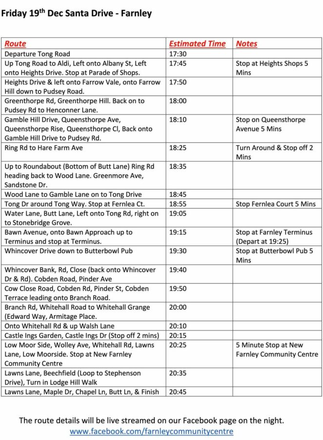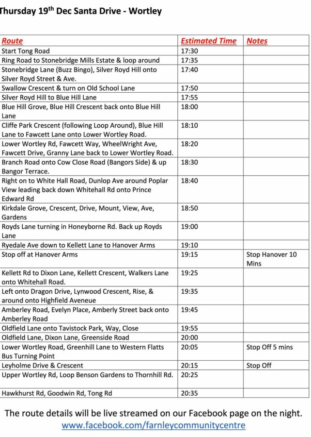 Santa’s first trip will be on Thursday 18th December, around Wortley, followed by Farnley on 19th December.
