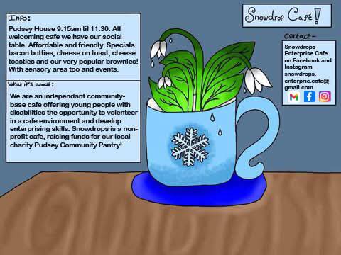 “Pudsey House 9:30am til 11:30. All welcoming cafe we have our social table.  Affordable and friendly. Specials bacon butties cheese on toast cheese toasties and our ever popular brownies! With sensory area too and events.”