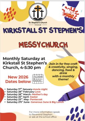 Messy Church is back starting 4pm - don't be late. We're going to have popcorn, snacks etc. (we now have a card reader at St Stephen's church, but cash is also good (for the popcorn etc.) Not sure what the final decision on film is, but sure to be family friendly on a Saturday afternoon.