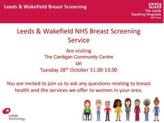Don't forget, Cardigan Community Centre have Leeds NHS Breast Screening Service coming in between 11 and 13:00. Come along with any questions, or to find out more about the services they offer