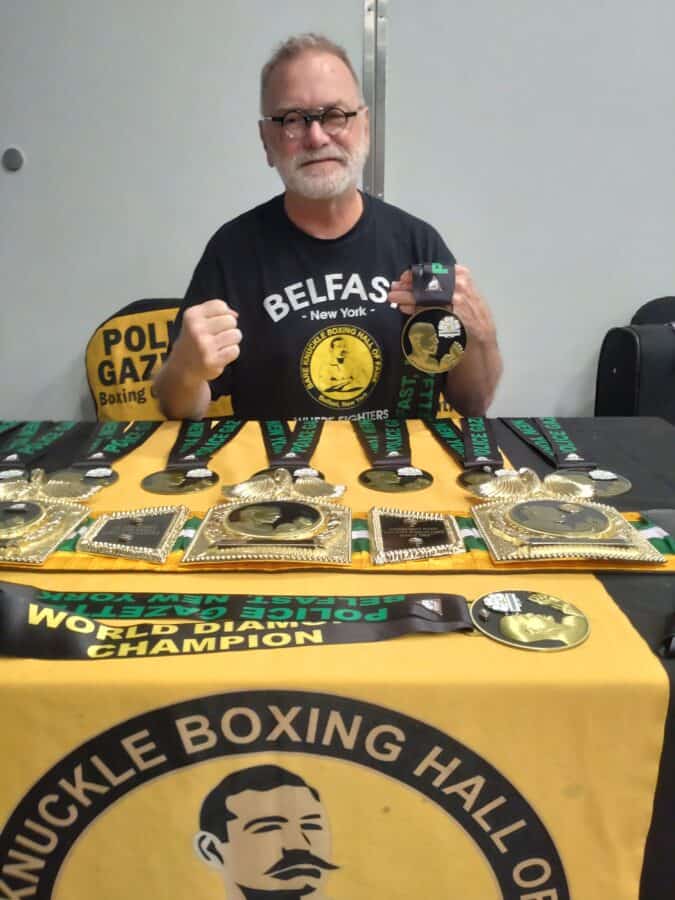 American visitor Scott Burt brought along the historic and prestigious Police Gazette belt worn in the ring by a victorious world champion bare knuckle fighter and which subsequently designates that fighter’s BKB status.
