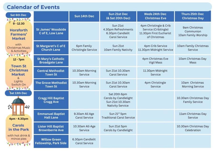 - You can find details of the Christmas services in Horsforth below and find out more about Horsforth Churches Together on their website.