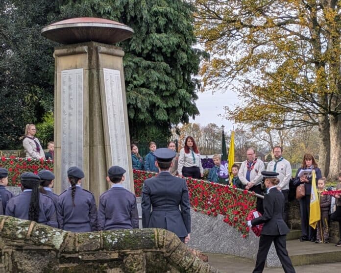 At the Bramley War Memorial, the Union Jack hung at half-mast writes Noelle Williamson. Air cadets, Guides and Scouts flanked the cenotaph, whose handrails were draped once again with handmade poppies.