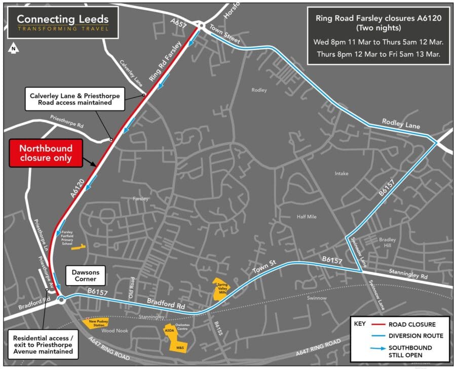 Farsley Ring Road will be closed from 8pm Wednesday, March 11, reopening Thursday, March 12 at 5am, then close again from 8pm Thursday, March 12 until 5am Friday, March 13. The road closure will be for the northbound traffic only heading towards Rodley.