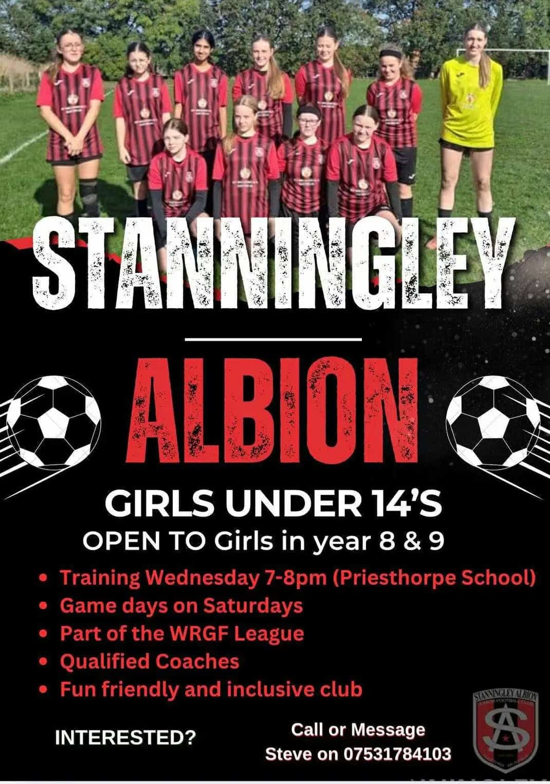 Stanningley Albion Girls train on Wednesdays, 7pm at Priesthorpe School. Call Steve on 07531 784103.