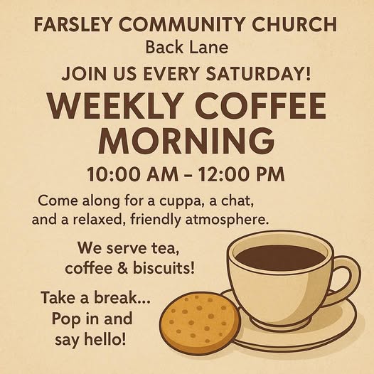 Farsley Community Church Back Lane, Farsley, LeedsIf you and about in Farsley on Saturday Morning why not pop in and see us? A lovely warm welcoming space with possibly the cheapest coffee around! Whatever the weather is you can be sure of a very warm welcome with a cup of warm coffee or tea and a biscuit at our coffee morning.