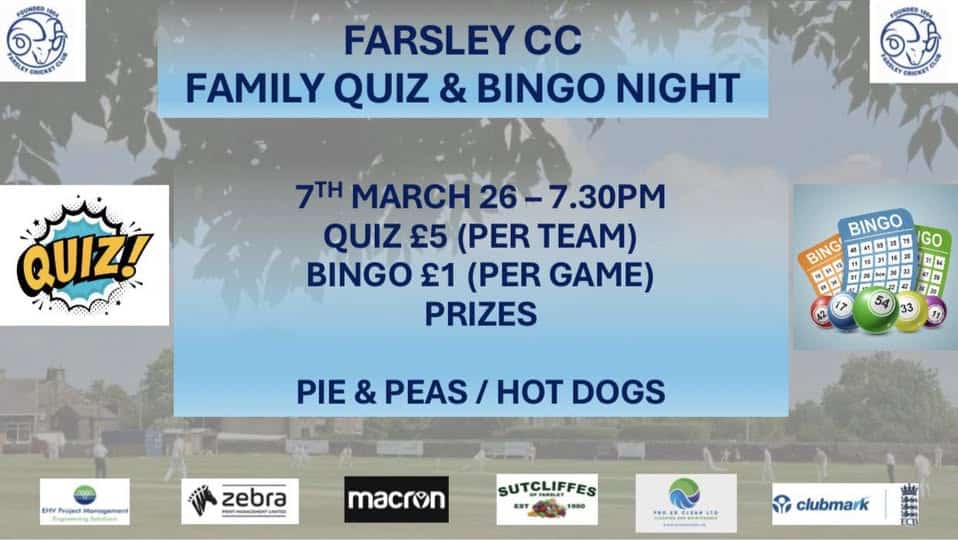 Farsley: Family Quiz and Bingo Night March 7 @ 7:30 pm Farsley Cricket Club The Pavilion Red Lane, Farsley, Leeds, United Kingdom Our first event of 2026, everyone welcome