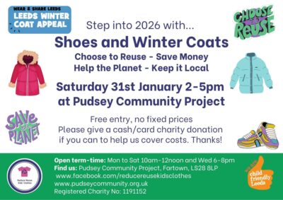 Pudsey Community Project runs a well-stocked children’s clothes exchange – all kinds of children’s clothes from 0-12 years old including school uniform, shoes, coats etc – saving people money and helping the planet at the same time!  There are no fixed prices – clothes are free with no pressure to give but if you’d like […]