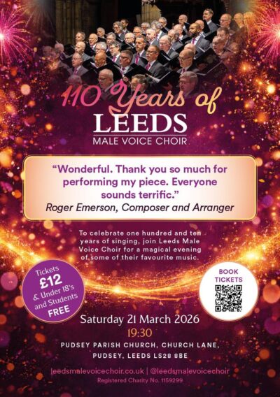 Join Leeds Male Voice Choir for a special evening of song! 110 years of Leeds Male Voice Choir Saturday 21 March 19:30 Pudsey Parish Church, Church Lane, Pudsey, Leeds, LS28 8BE